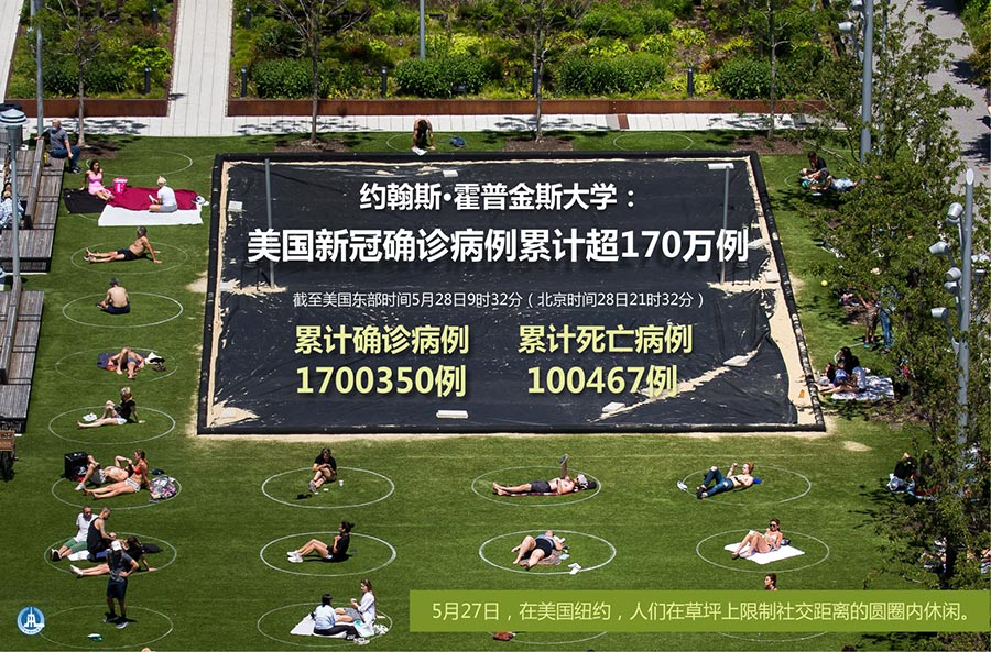 新華社紐約5月28日電 美國約翰斯·霍普金斯大學28日發(fā)布的新冠疫情最新統(tǒng)計數(shù)據(jù)顯示,截至美國東部時間28日9時32分(北京時間28日21時32分),美國累計確診病例達1700350例,累計死亡病例達100467例。