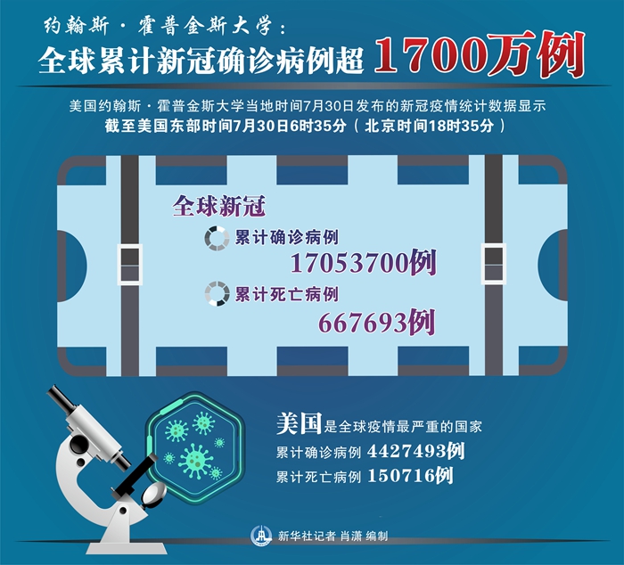 新華社紐約7月30日電 美國約翰斯·霍普金斯大學(xué)30日發(fā)布的新冠疫情統(tǒng)計數(shù)據(jù)顯示,截至美國東部時間30日6時35分(北京時間18時35分),全球累計確診病例達(dá)到17053700例,累計死亡667693例。
