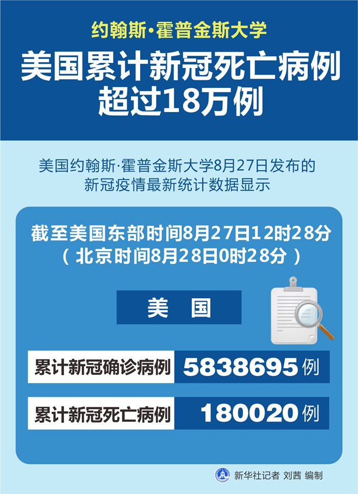 新華社紐約8月27日電? 美國(guó)約翰斯·霍普金斯大學(xué)27日發(fā)布的新冠疫情最新統(tǒng)計(jì)數(shù)據(jù)顯示,截至美國(guó)東部時(shí)間27日12時(shí)28分(北京時(shí)間28日0時(shí)28分),美國(guó)累計(jì)新冠死亡病例180020例,累計(jì)確診病例5838695例。