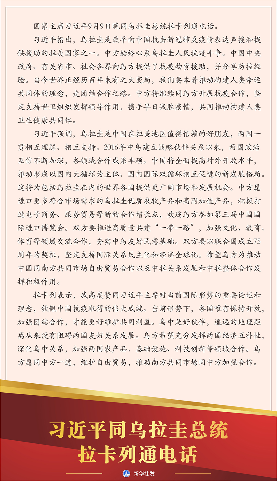 新華社北京9月9日電? 國家主席習(xí)近平9月9日晚同烏拉圭總統(tǒng)拉卡列通電話。