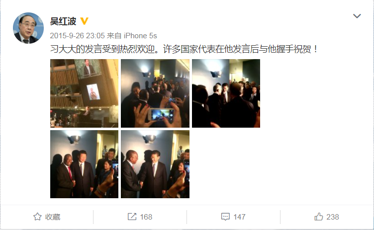 時任聯(lián)合國副秘書長吳紅波說,習(xí)主席走下講臺時,二三十位其他國家領(lǐng)導(dǎo)人排隊與他握手表示祝賀,走廊里擠得滿滿當當。