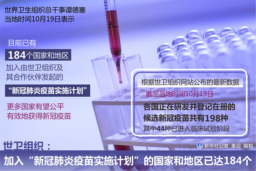 新華社日內(nèi)瓦10月19日電(記者聶曉陽 陳俊俠)世界衛(wèi)生組織總干事譚德塞19日表示,目前已有184個(gè)國家和地區(qū)加入由世衛(wèi)組織及其合作伙伴發(fā)起的“新冠肺炎疫苗實(shí)施計(jì)劃”,更多國家有望公平有效地獲得新冠疫苗。