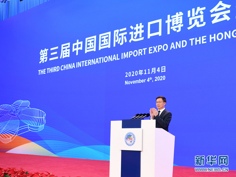 11月4日,中共中央政治局常委、國(guó)務(wù)院副總理韓正在上海出席第三屆中國(guó)國(guó)際進(jìn)口博覽會(huì)開(kāi)幕式。這是韓正宣布第三屆中國(guó)國(guó)際進(jìn)口博覽會(huì)開(kāi)幕。 新華社記者 燕雁 攝