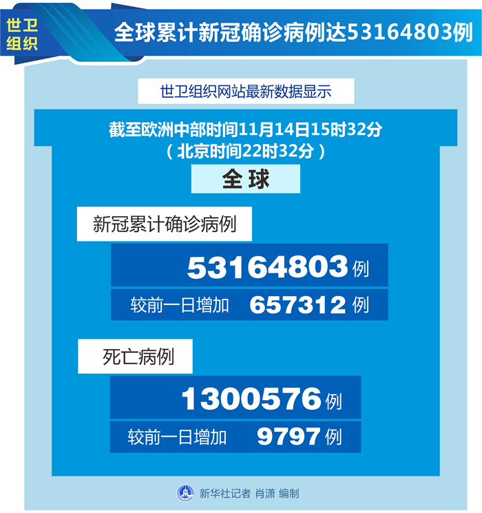 新華社日內(nèi)瓦11月14日電(記者劉曲)世界衛(wèi)生組織14日公布的最新數(shù)據(jù)顯示,全球累計(jì)新冠確診病例達(dá)53164803例。