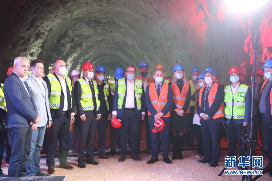 10月21日,在波黑泛歐5C走廊高速公路波契泰利隧道,中國施工方與波黑政府及業(yè)主方在隧道貫通后合影留念。新華社發(fā)(中建公司供圖)