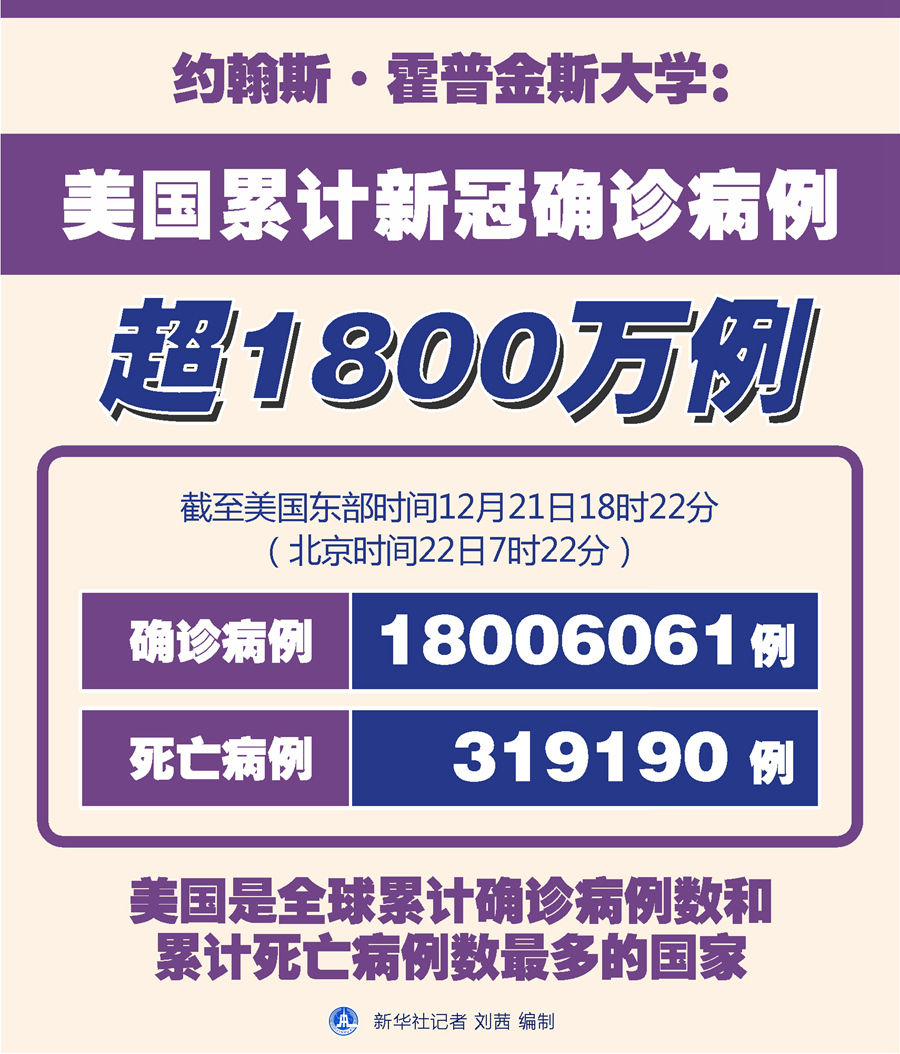 新華社紐約12月21日電 美國約翰斯·霍普金斯大學(xué)21日發(fā)布的新冠疫情最新統(tǒng)計(jì)數(shù)據(jù)顯示,美國累計(jì)確診病例超過1800萬例。
