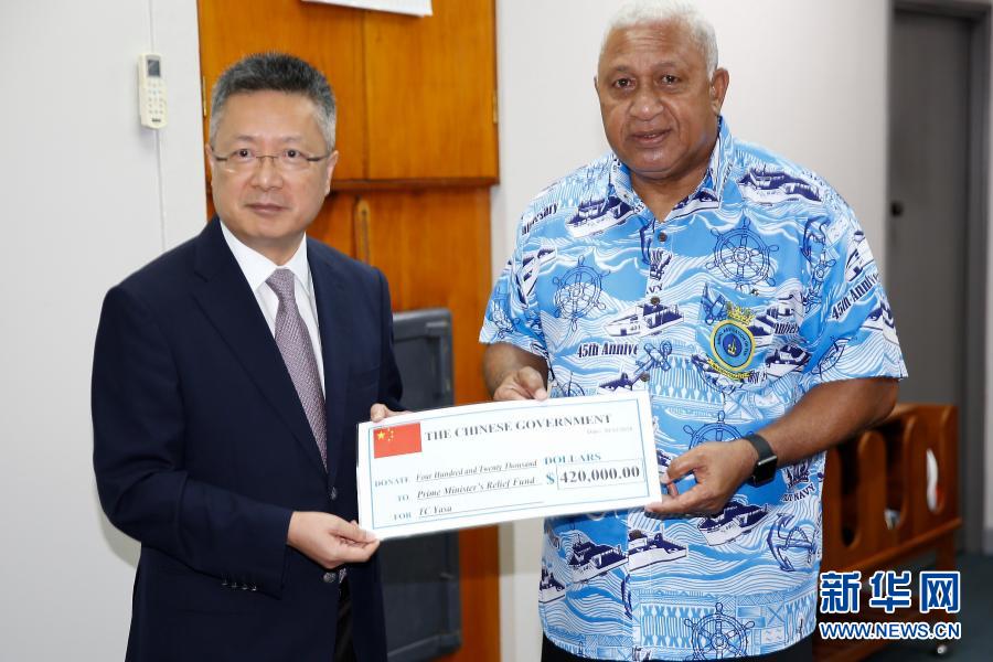12月30日,在斐濟(jì)蘇瓦,中國(guó)駐斐濟(jì)大使錢(qián)波(左)向斐濟(jì)總理姆拜尼馬拉馬轉(zhuǎn)交援助款。中國(guó)政府30日向斐濟(jì)政府提供42萬(wàn)斐濟(jì)元(約合20萬(wàn)美元)的緊急人道主義援助,以幫助斐濟(jì)在遭受熱帶氣旋“亞薩”襲擊成災(zāi)后進(jìn)行重建。當(dāng)天在斐濟(jì)總理辦公室舉行的儀式上,中國(guó)駐斐濟(jì)大使錢(qián)波代表中國(guó)政府向斐濟(jì)總理姆拜尼馬拉馬轉(zhuǎn)交了這筆援助款。新華社記者張永興攝