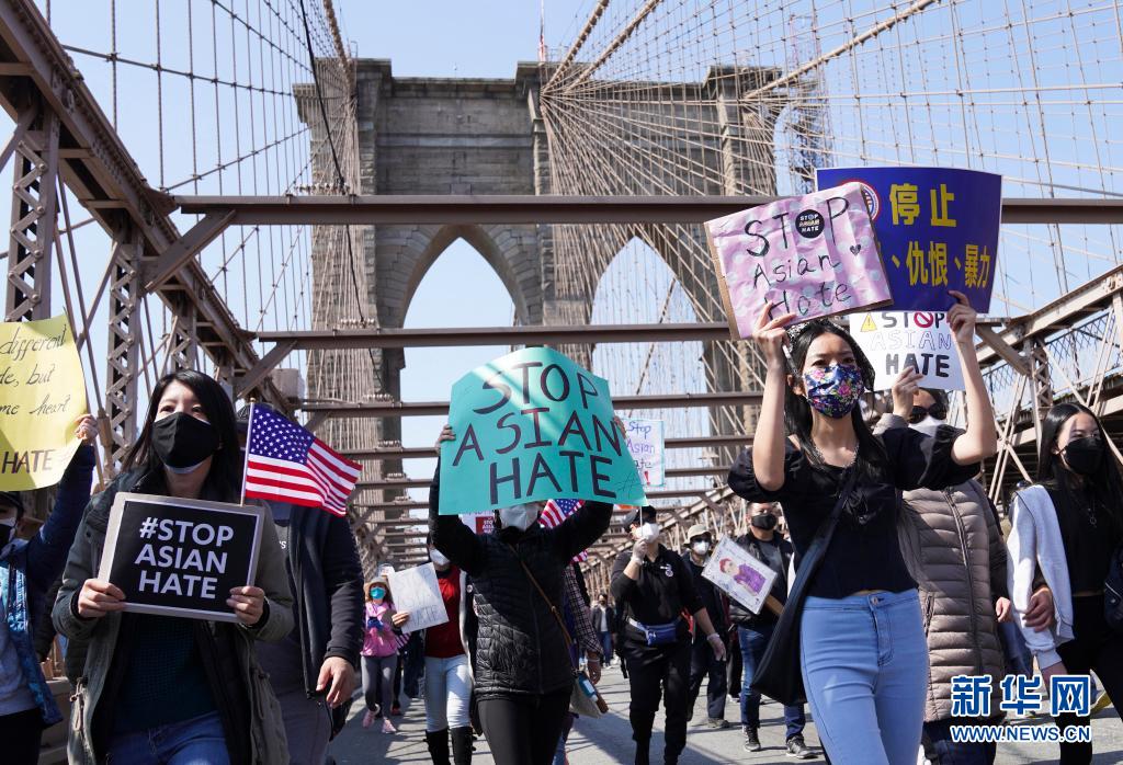 2021年4月4日,反對亞裔仇恨的游行隊伍走過美國紐約的布魯克林大橋。2020年以來,由于少數(shù)美國政客借疫情污名化亞裔,致使針對亞裔的種族歧視和仇恨犯罪不斷升級。 新華社記者 王迎 攝