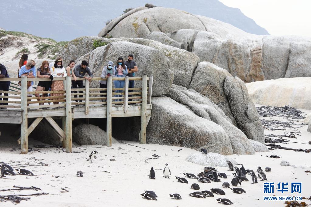 4月25日,游客在南非西蒙鎮(zhèn)企鵝灘觀賞非洲企鵝。