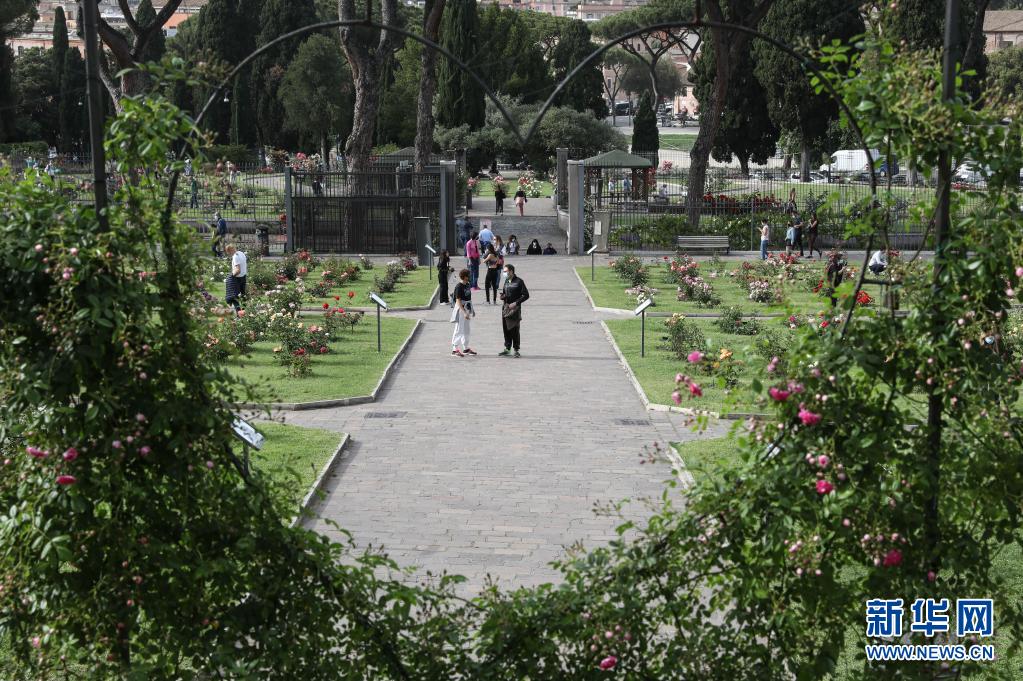 5月17日,人們?cè)谝獯罄锥剂_馬玫瑰園游覽。