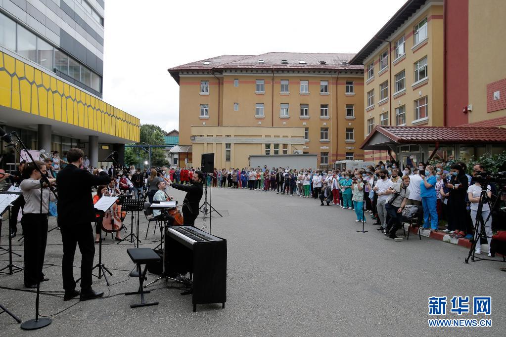 當(dāng)日,羅馬尼亞首都布加勒斯特一個樂隊在該國一家傳染病醫(yī)院——馬太·巴爾什醫(yī)院演出,向抗擊新冠疫情的醫(yī)務(wù)工作者致謝。