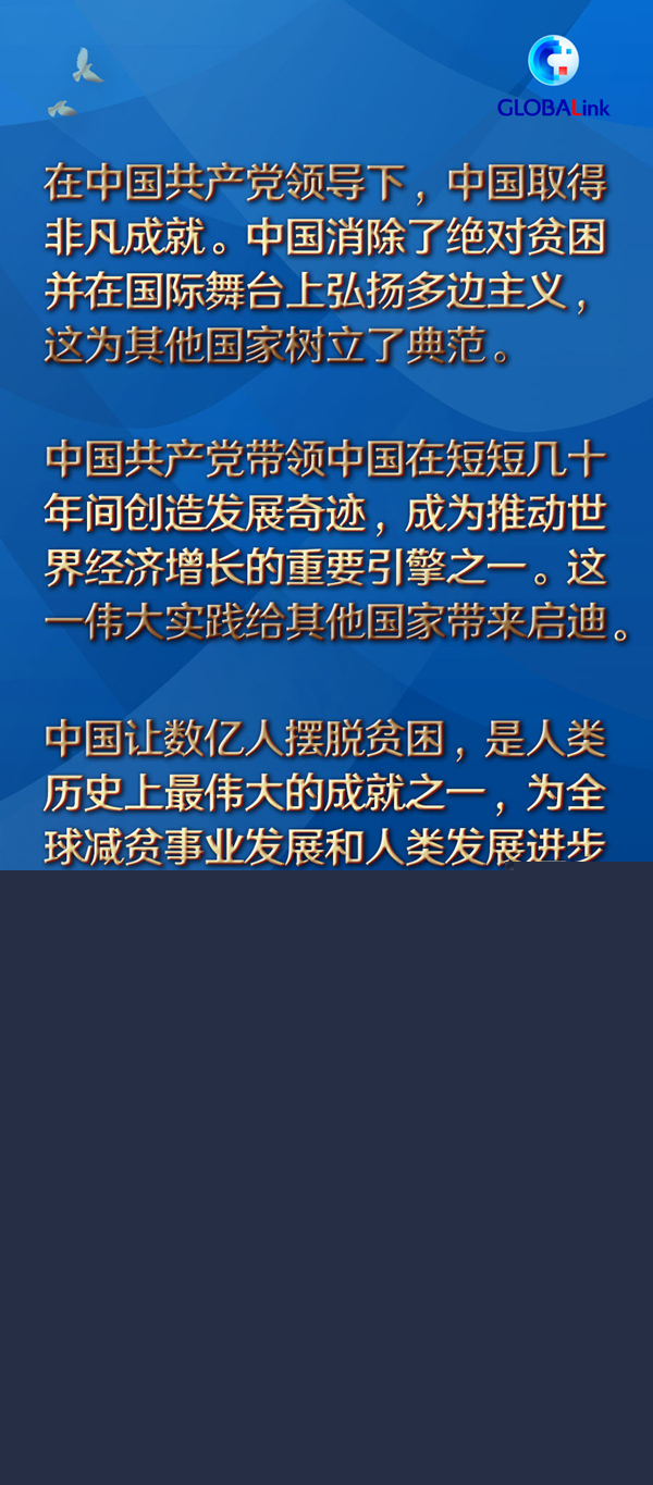 “新中國(guó)成立之時(shí),中國(guó)還很貧窮。中國(guó)共產(chǎn)黨帶領(lǐng)中國(guó)在短短幾十年間創(chuàng)造發(fā)展奇跡,成為推動(dòng)世界經(jīng)濟(jì)增長(zhǎng)的重要引擎之一。這一偉大實(shí)踐給其他國(guó)家?guī)?lái)啟迪?!?/p>