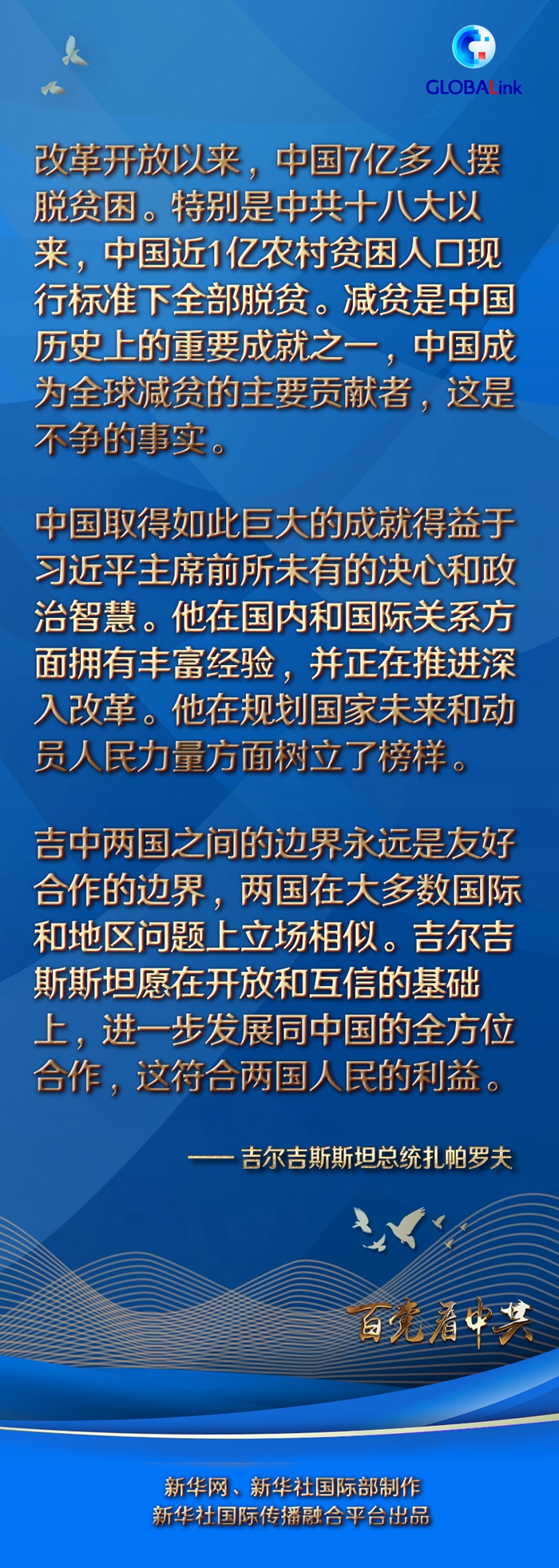 扎帕羅夫特別提到中國的減貧成就。他說,改革開放以來,中國7億多人擺脫貧困。特別是中共十八大以來,中國近1億農(nóng)村貧困人口現(xiàn)行標(biāo)準(zhǔn)下全部脫貧。“減貧是中國歷史上的重要成就之一,中國成為全球減貧的主要貢獻(xiàn)者,這是不爭(zhēng)的事實(shí)。”